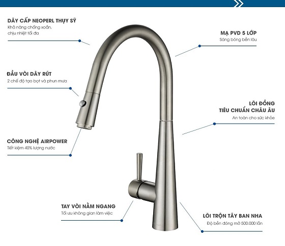 Vòi rửa bát nóng lạnh dây rút Inox 304 Miken MK-1901N