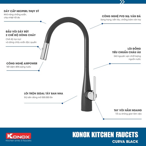 Chức năng: Nóng lạnh + Rút dây + Đầu vòi khớp xoay + 2 chức năng Sprayer (Dòng chảy thắt eo, tạo bọt khí) + Xoay 360 độ