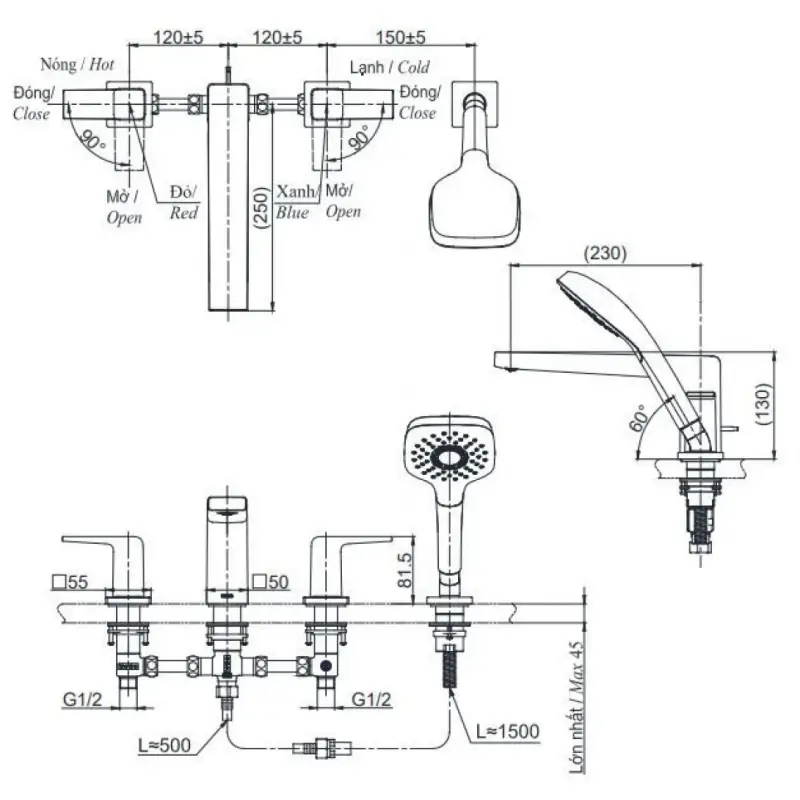 - Lắp đặt: Gắn thành bồn tắm 4 lỗ.
