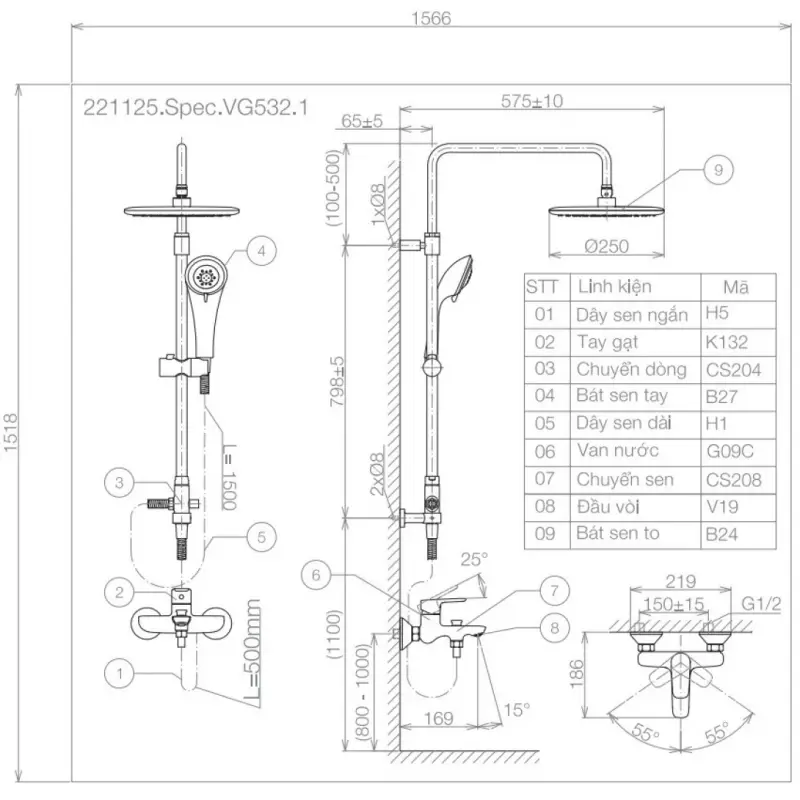 Thông Số Kỹ Thuật Chi Tiết Của Vòi Sen Cây Viglacera VG532.1:
