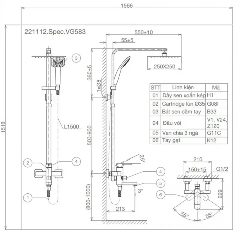Thông Số Kỹ Thuật Chi Tiết Của Vòi Sen Cây Viglacera VG583: