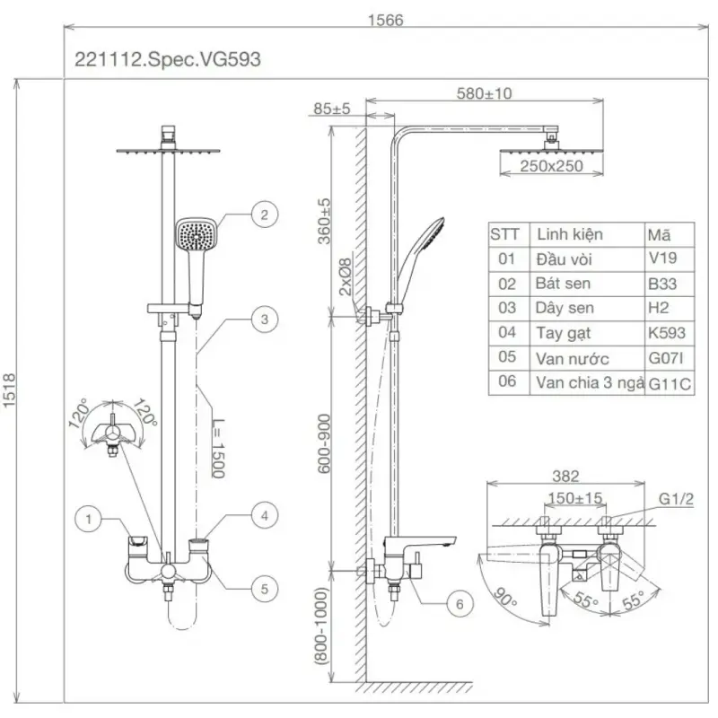 Thông Số Kỹ Thuật Chi Tiết Của Vòi Sen Cây Viglacera VG593:
