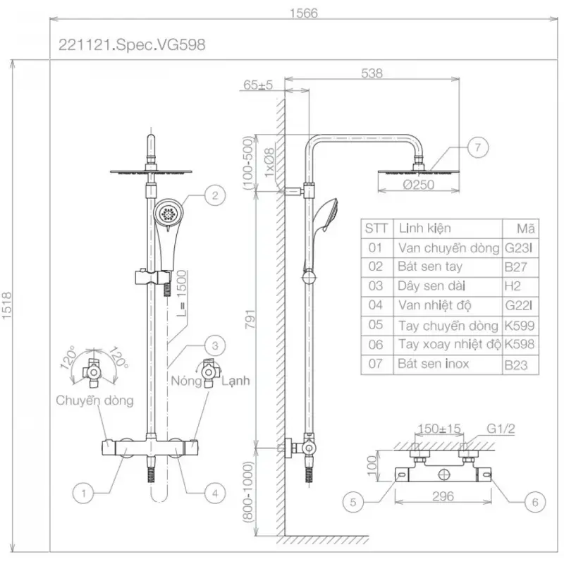 Thông Số Kỹ Thuật Chi Tiết Của Vòi Sen Cây Viglacera VG598: