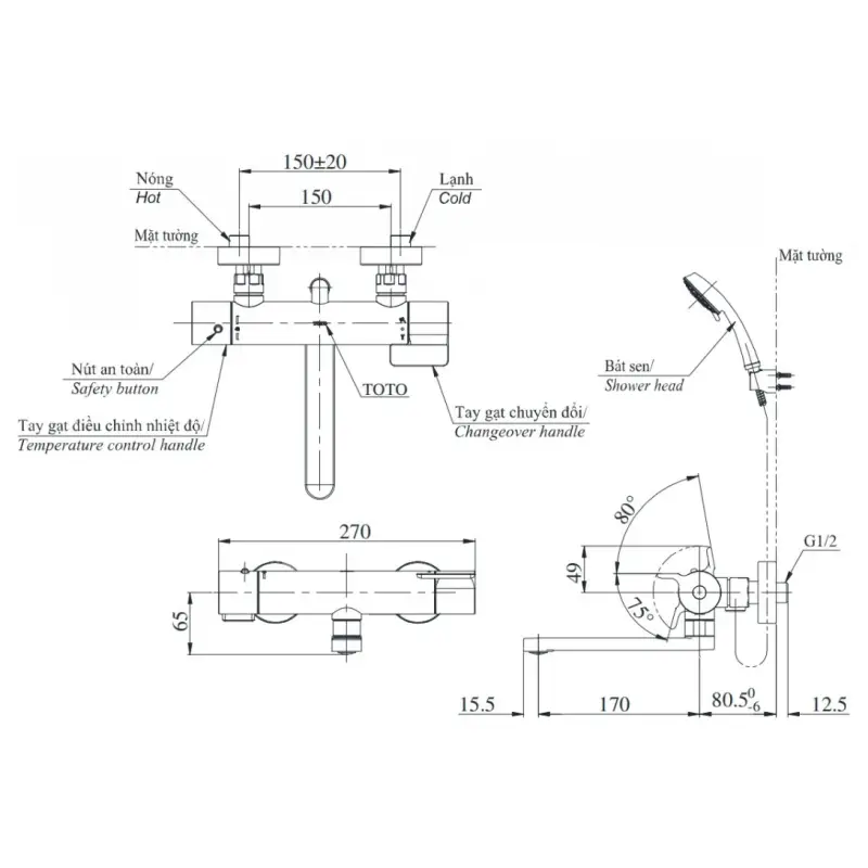 Vòi sen TOTO TBV03427V/TBW01010V nhiệt độ Nhật xả bồn